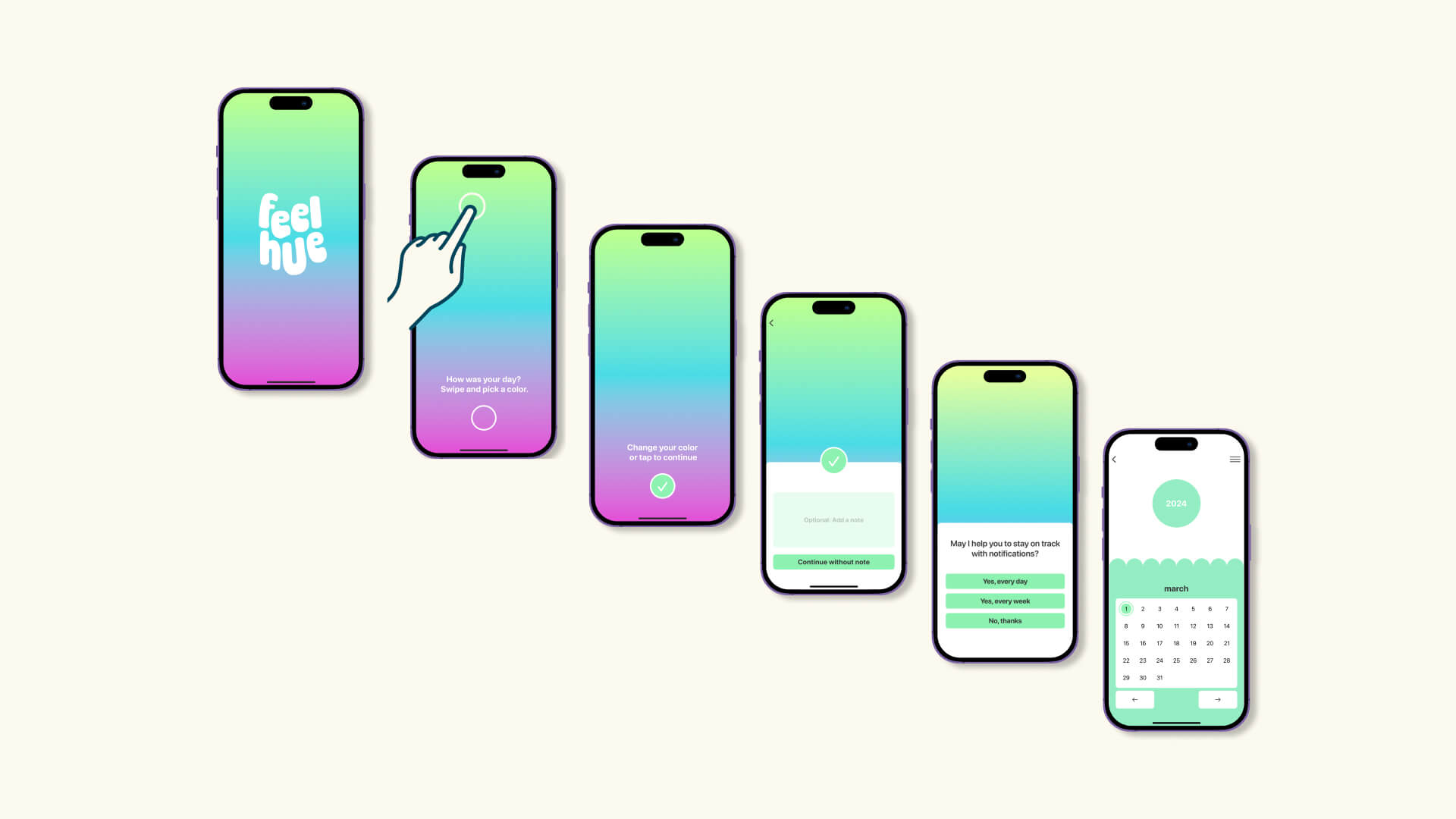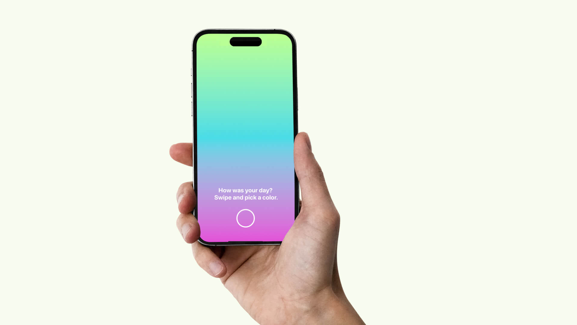 Concept for a mood tracking app based on color. The User can track their mood based on the color they feel today. in the end they can see what color their mood was that year and month.